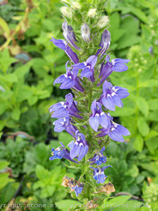 Great Blue Lobelia, Lobelia siphilitica, native to eastern and central North America, is a short-life perennial (lives just a few years) that blooms August well into fall in our area. Grows up to three feet tall and prefers wet to very moist soil.