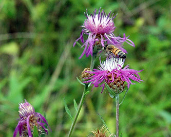 Black Knapweed, Centaurea nigra, a perennial of Eurasian origin that blooms in late summer and fall. The base of the flower is dark. There is also a Brown Knapweed, with a lighter brown flower base.