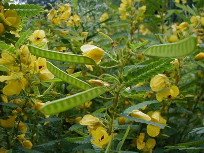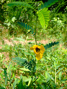 Partridge Pea, Chamaecrista fasciculata, ia an annual plant of nitrogen-fixing legume family native to the US east of the Rockies, except for the Gulf Coast and northern New England. It blooms August to frost in our region, possibly earlier (field verification needed). It produces lots of dime-sized yellow flowers, and in larte summer, pea pods.