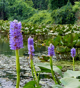Pickerel Weed, Pontederia cordata, is a perennial emergent aquatic native to the eastern Americas from Canada to Argentina. It likes full sun and quiet water, and so grows along lake, pond and marsh edges. It grows about four feet high, with the bottom rwo feet underwater. Blooms June through fall in our area.