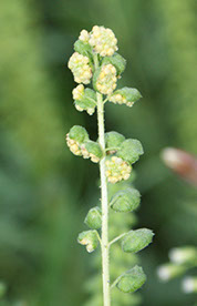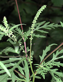 Ragweed, Ambrosia psilostachya, the notorious plant who's pollen is the cause of allergy misery for millions, is a perennial that is native to North America from the southerm provinces of Canada to northern Mexico. Very tiny flowers grow in clusters at the tips of the stems,