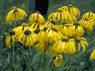 Cutleaf Coneflower or Tall Coneflower, Rudbeckia laciniata, a perennial native to many parts of North America, from southern Canada to the Gulf Coast, except for southwestern US. Large flowers three to four inches across and deeply cut leaves. Blooms late June to September. Flowers droop and centers turn brown as the season progresses.
