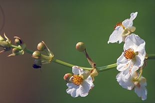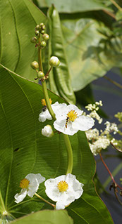Arrowhead, Duck Potato, Saggittaria latifolia, a aquatic native perennial found in ponds and marshes across North America. The potato-like tubers are eaten by ducks and humans: they were harvested for food both by American Indians and European settlers. Flowers may reach two feet or more above the water. The leaves are shaped like arrowheads. Blooms August into September.