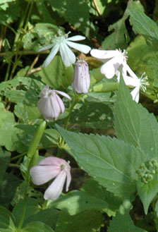 Bouncing Bet, Soapwort, Saponaria officinalis, is a Eurasian native naturalized in all lower 48 US states and in the southern tier of Canadian provinces. Prefers moist, cool locations. Individual flowers last three days. Boiling the leaves and roots makes a mild soap. The plant, especially the roots, contains a toxin, and should not be eaten.