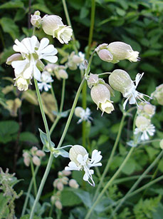 Bladder Campion, Silene vulgaris, is a European import, probably escaped from gardens centuries ago. In addition to attractive flowers, the leaves are eaten in Spain, Italy and other Mediterranean countries. It Is now naturalized throughout most of North America, as far north as the south coast of Alaska. Blooms August and September with flowers less than an inch across.