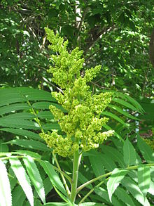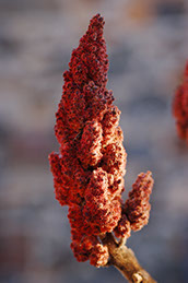 Staghorn Sumac, Rhus typhina, is a flowering and fruiting perennial deciduous shrub that grows as high as 15 foot tall, It is native to northeastern United States, adjoining parts of Canada, and south along the Appalachian spine. It flowers largely unoticed in May and June, but by late July and through fall bears conical clusters of deep red fruit that have the appearence of flowers. This fruit can be mashed and soaked in cold (not hot) water for four to eight hours, strained or filtered, and sweetened to make a delicious beverage. Staghorn sumac is not at all related to poison sumac. In the fall the leaves of this plant turn brilliant red, yellow and orange before dropping. Photos show flower, ripe and dried fruit.