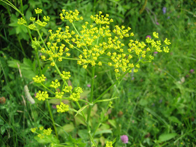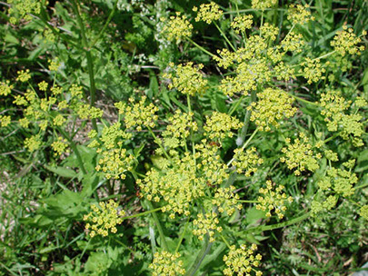Wild Parsnip, Pastinaca sativa, is related to Queen Anne's Lace and is the ancestor of the domestic parsnip. This biennial native to Eurasia produces an edible taproot in the first year. It flowers in the second year, but by this time the root is woody and inedible, which is also true of domestic parsnips. Be careful handling this plant, as some people get a rash from the sap.